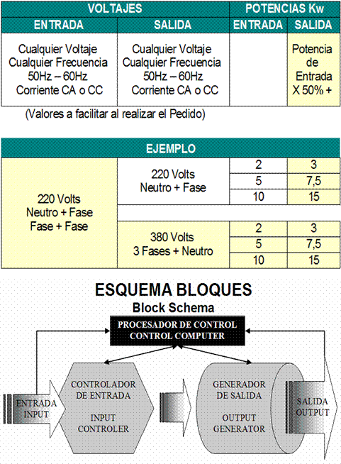 Entrada Bifásica (2 hilos) 220v 10kw..............Salida Trifásica (3 o 4 hilos) 380v 15 kw |